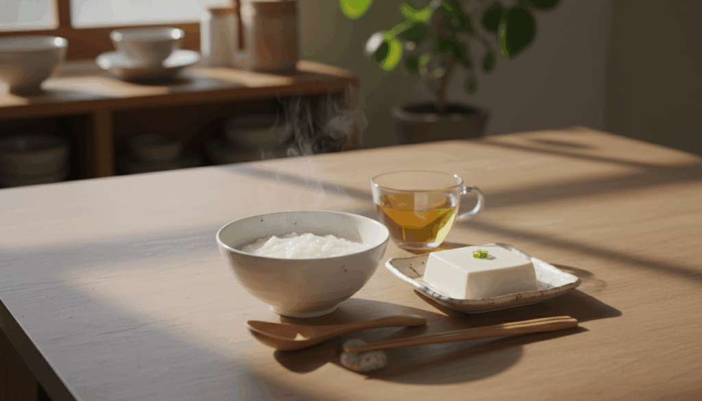 具体的には、うどん、そうめん、白米、おかゆ、パン類(雑穀、ライ麦、ドライフルーツが入っていないもの)、卵、豆腐、肉、魚などがおすすめです。逆に避けるべき食品は、そば、ラーメン、胚芽米、発芽玄米、雑穀米、野菜全般、果物全般、豆類、こんにゃく、キノコ類、海藻類、ネギなどの薬味類、ごま、ナッツ類、納豆、ふりかけ、ジャム、野菜ジュース、青汁、乳製品です。