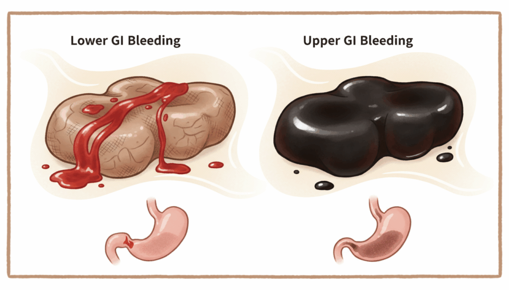 鮮血便は、肛門に近い部位からの出血で見られることが多く、赤い血液が便に付着したり、便器が赤く染まったりします。一方、黒色便は胃や十二指腸など上部消化管からの出血で見られ、コーヒーの残りかすのような黒っぽい便が特徴です。