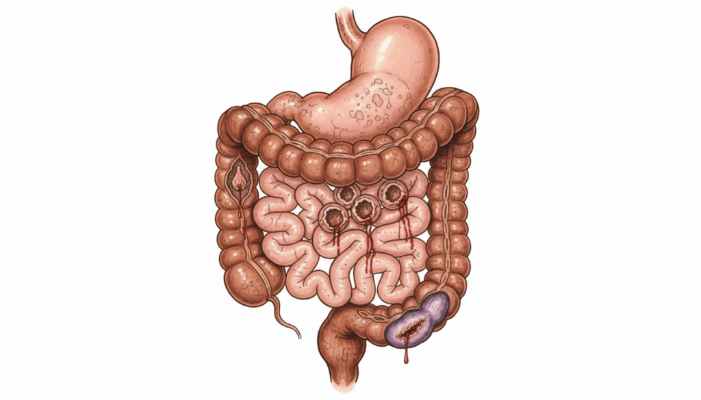 ただし、ストレスが間接的に消化器系に影響を及ぼし、結果として出血につながるケースは存在します。強いストレスや不摂生が続くと「胃潰瘍」や「十二指腸潰瘍」を発症し、上部消化管から出血することがあります。また、ストレスによって「過敏性腸症候群」を発症し、繰り返す下痢で肛門周囲が傷つき出血するケースもあります。